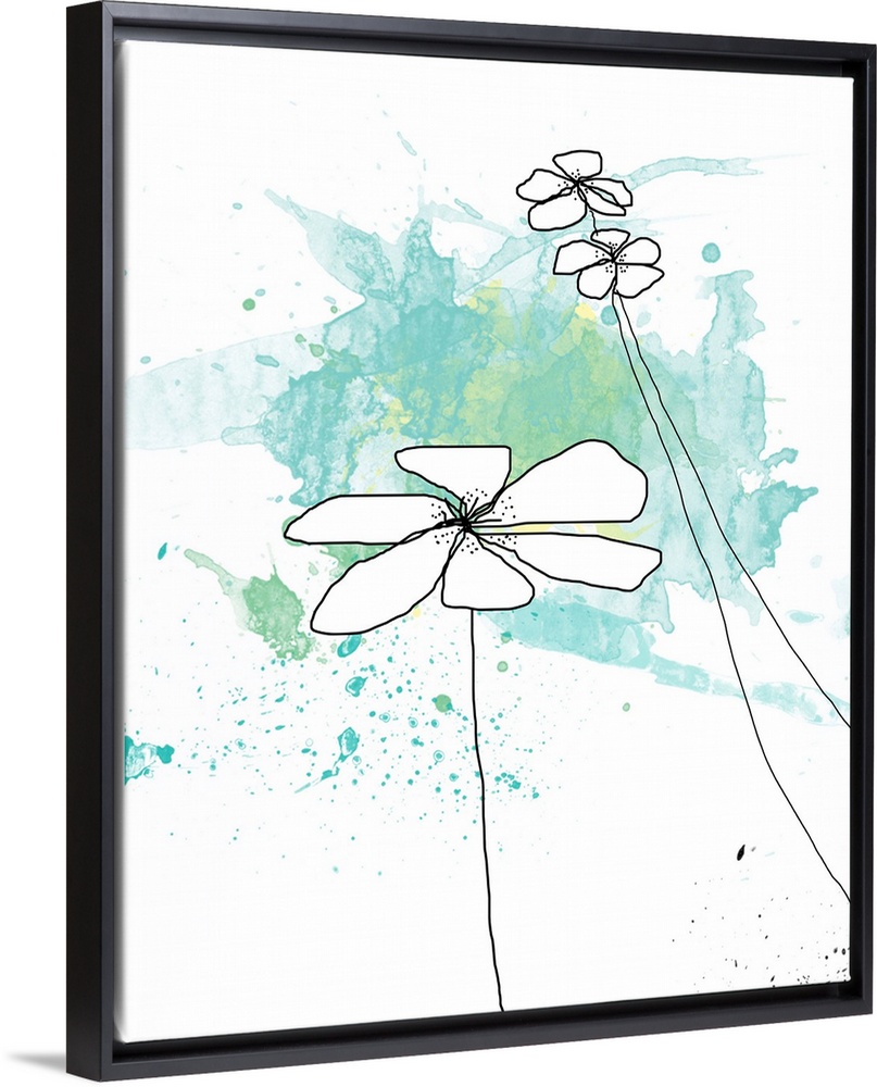 <p>Giant contemporary art includes a group of three outlined flowers with minimal detail sitting in front of a background that includes a few splashes of cool toned watercolors.</p>