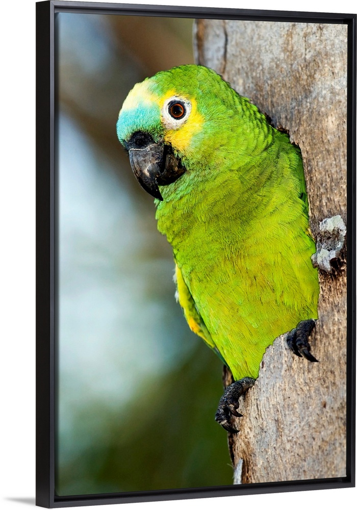 <p>Blue-fronted parrot (Amazona aestiva), emerging from a tree hole. This parrot nests in tree cavities. It is found in woodland areas of tropical South America, but not generally in dense rainforests. Parrots eat mainly seeds and fruit. Photographed in Brazil, in the Pantanal, the world's largest wetland region.</p>