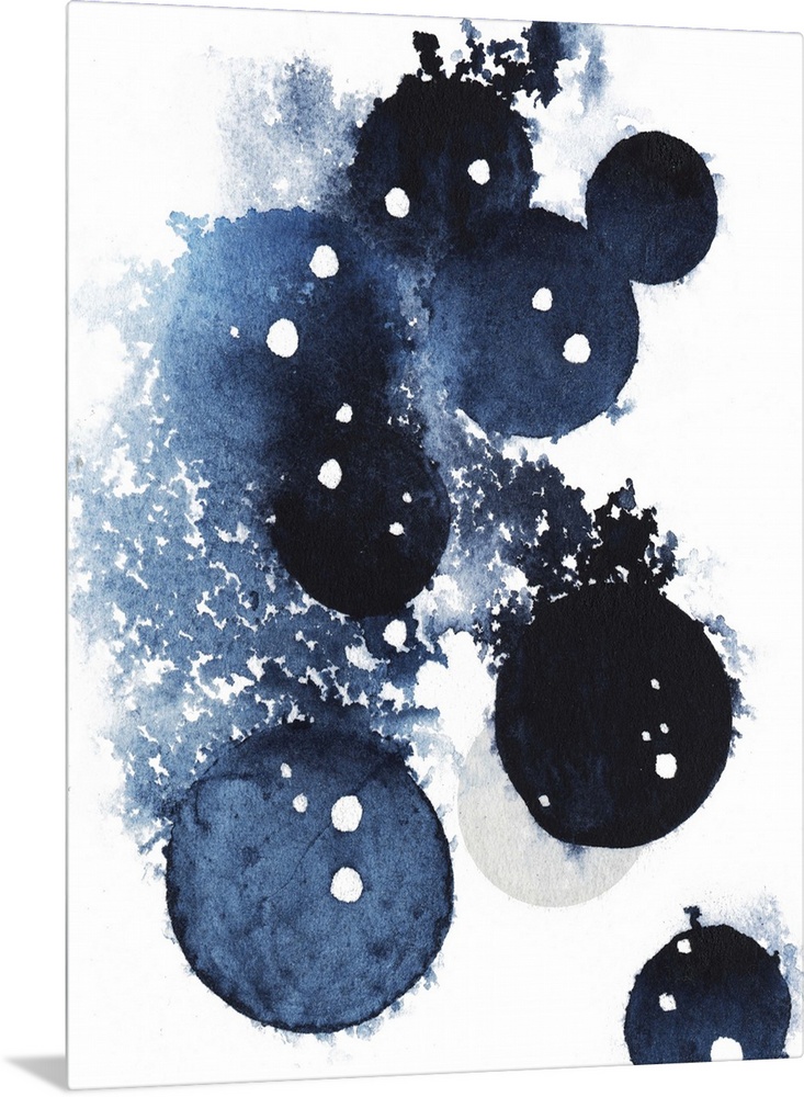 <p>Contemporary abstract artwork of blue globular shapes with bleed stretching out into empty space.</p>
