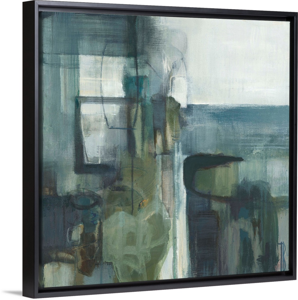 <p>Contemporary abstract painting using pale muted blue and green tones.</p>