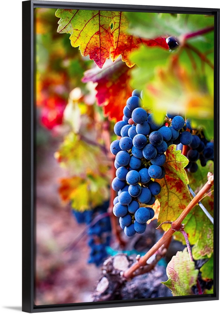 <p>Fine art photo of a boldly colored bunch of grapes still on the vine.</p>