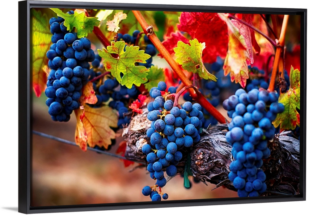 <p>Fine art photo of a boldly colored bunch of grapes still on the vine.</p>