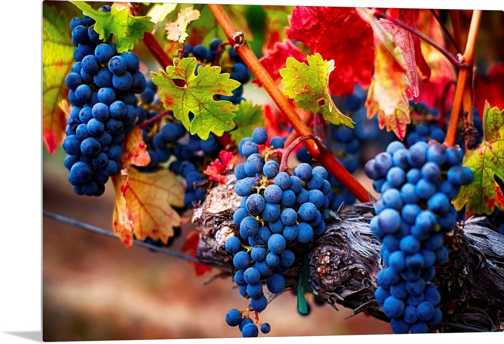 <p>Fine art photo of a boldly colored bunch of grapes still on the vine.</p>
