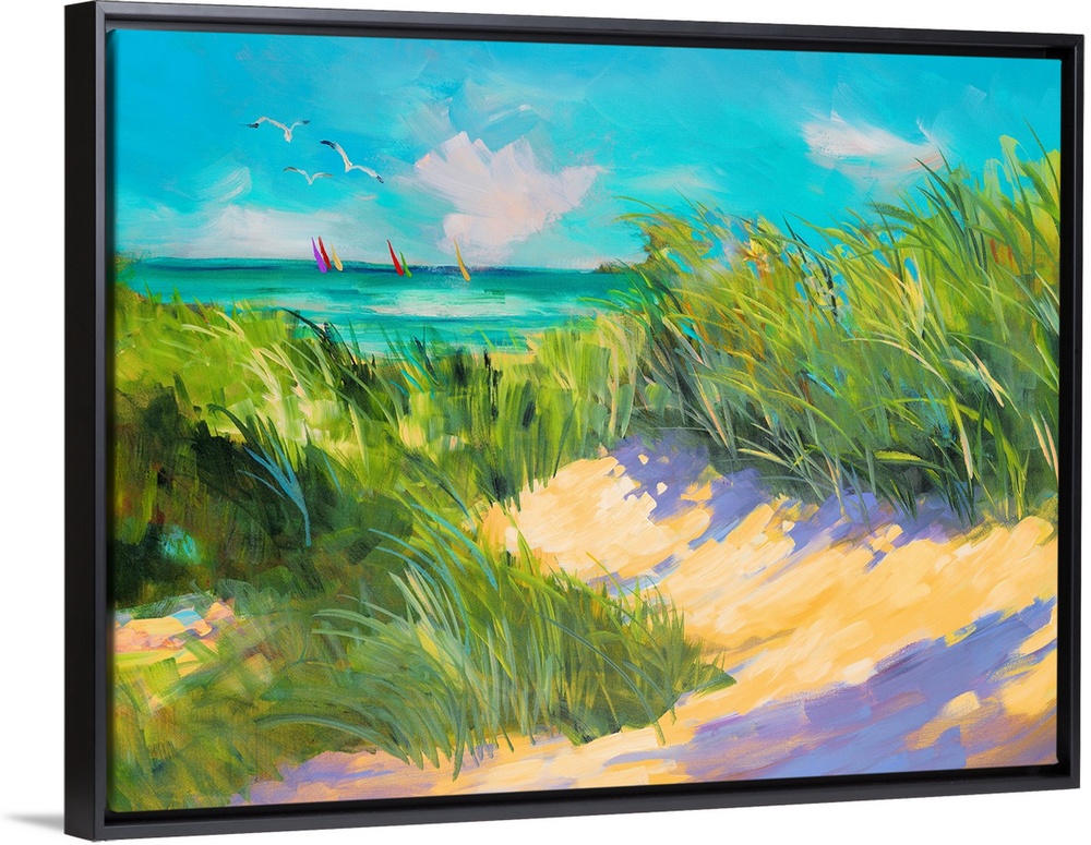 <p>Contemporary painting of a realizing beach scene. The ocean is framed by dune grass bending in the wind, as seagulls fly over the sea.</p>
