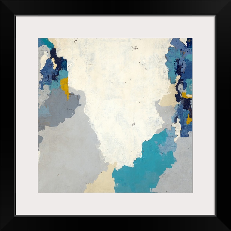 <p>Large square abstract art in shades of blue, gray, brown, orange, and cream.</p>