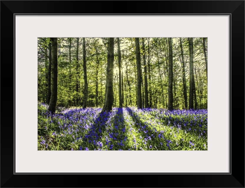 <p>Sunlight shining through woodland with blue bell flowers.</p>