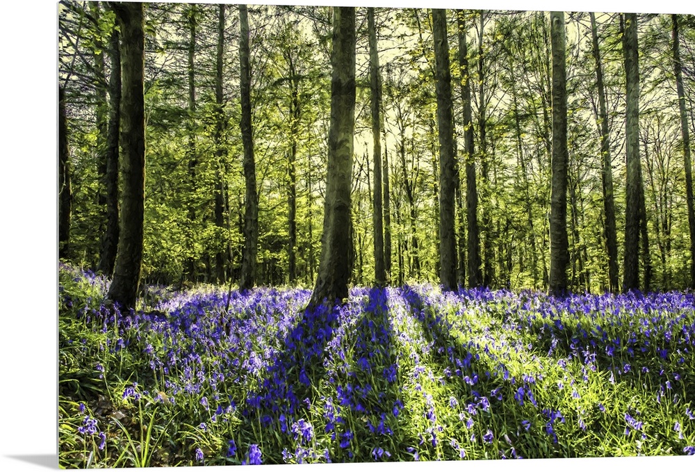 <p>Sunlight shining through woodland with blue bell flowers.</p>