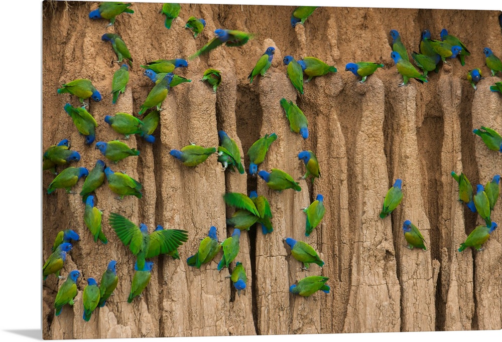 <p>A group of blue-headed parrots cling to the vertical, clay cliffs that line the Manu River in Peru's Amazon Basin. The noisy, foot-tall parrots congregate each morning to nibble minerals embedded in the clay. The minerals counter toxins the birds ingest when eating certain nuts and fruits included in their diet.</p>