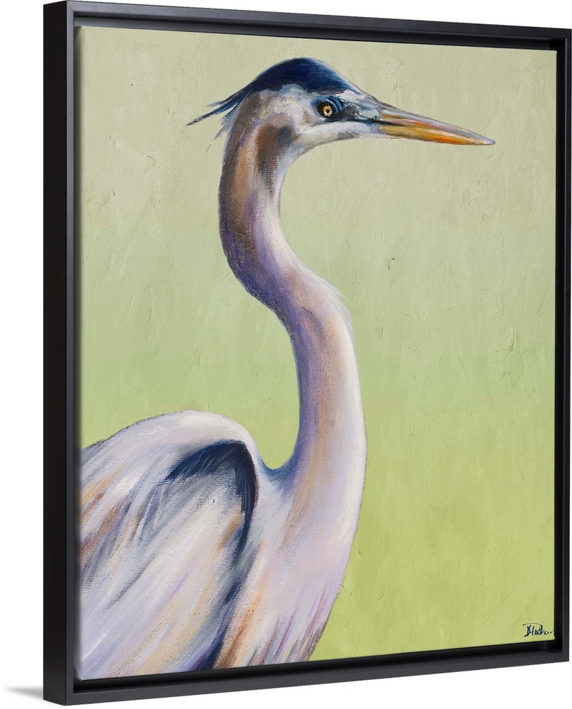 <p>Contemporary painting of a Great Blue Heron against a pale green background.</p>