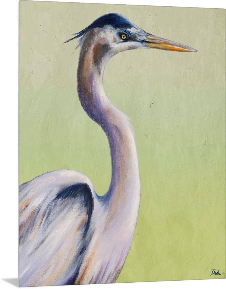 <p>Contemporary painting of a Great Blue Heron against a pale green background.</p>