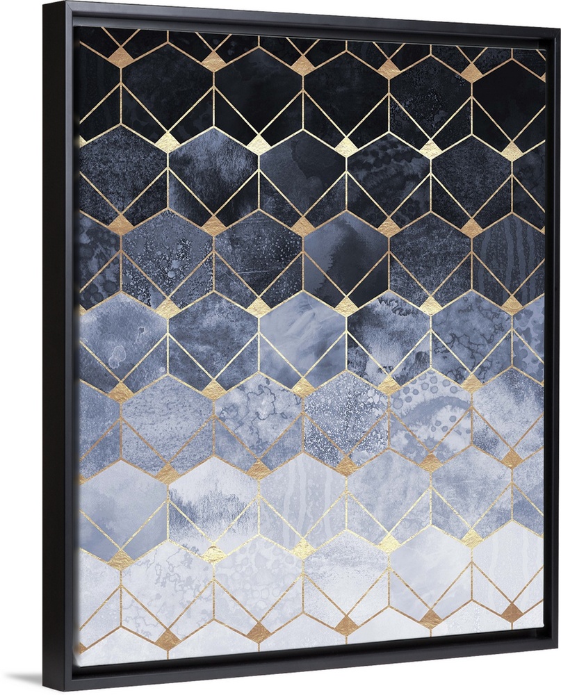 <p>A prism of triangles in various shades of textured ivory and navy are arranged in to form a three-dimensional prism effect. The individual shapes are outlined in gold.</p>