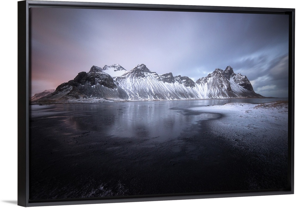 <p>Pastel sky over dark mountains covered in fresh snow in Stokksnes, Iceland.</p>
