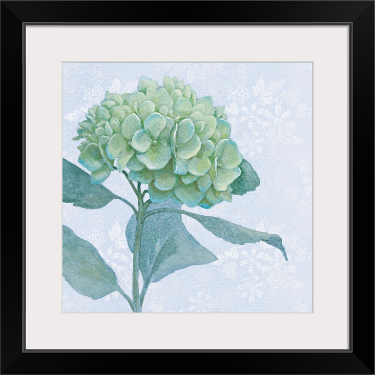 <p>Painting of hydrangea blossoms in soft blue and green tones.</p>