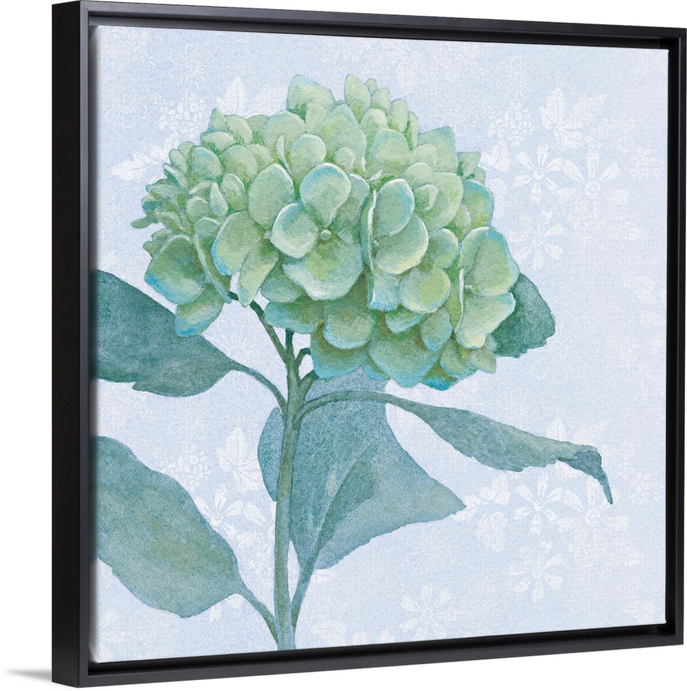 <p>Painting of hydrangea blossoms in soft blue and green tones.</p>