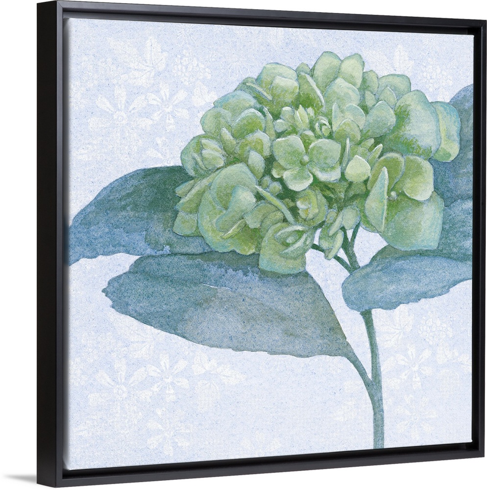 <p>Painting of hydrangea blossoms in soft blue and green tones.</p>