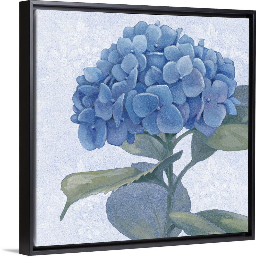 <p>Painting of hydrangea blossoms in soft blue and green tones.</p>