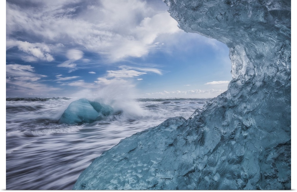<p>Blue ice and icebergs with water splashing at Jokulsarlon, South coast; Iceland</p>