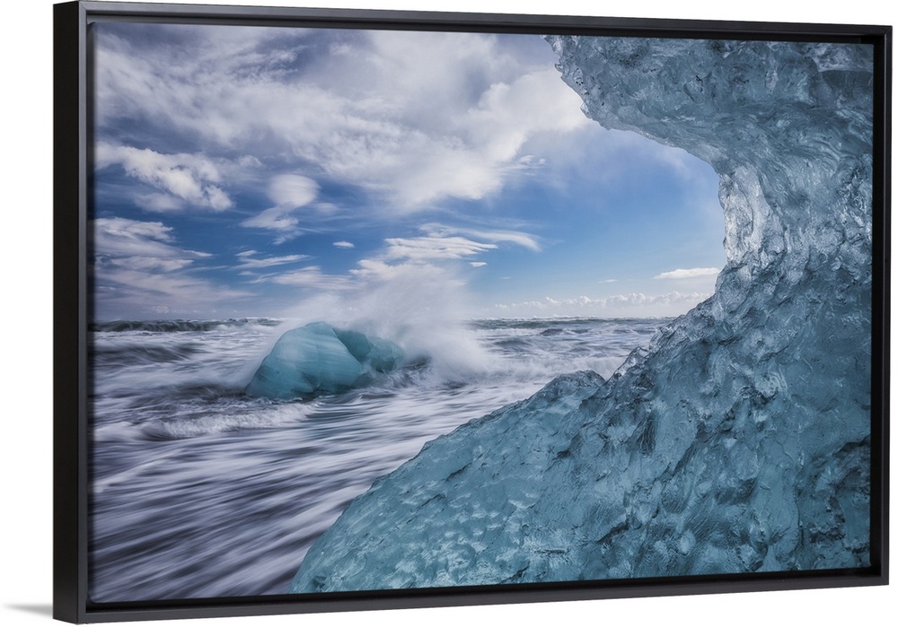 <p>Blue ice and icebergs with water splashing at Jokulsarlon, South coast; Iceland</p>