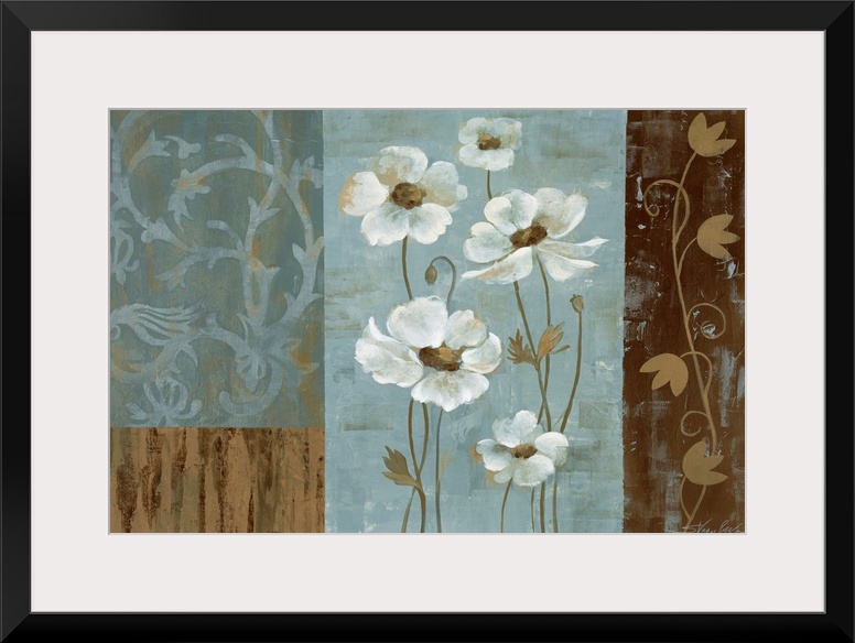 <p>Large, landscape artwork for a living room or office. Four separate rectangular areas, each in tones of blues or browns with different patterns and shapes in each section, the main focus being the white anemones on a light blue patchy background.</p>