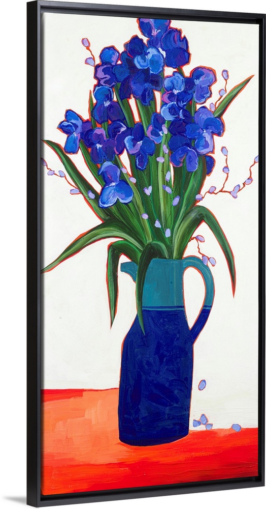 <p>Vibrant, stylized painting of blue irises in a blue pitcher on a bold orange-red surface, featuring strong outlines and a modern aesthetic.</p>