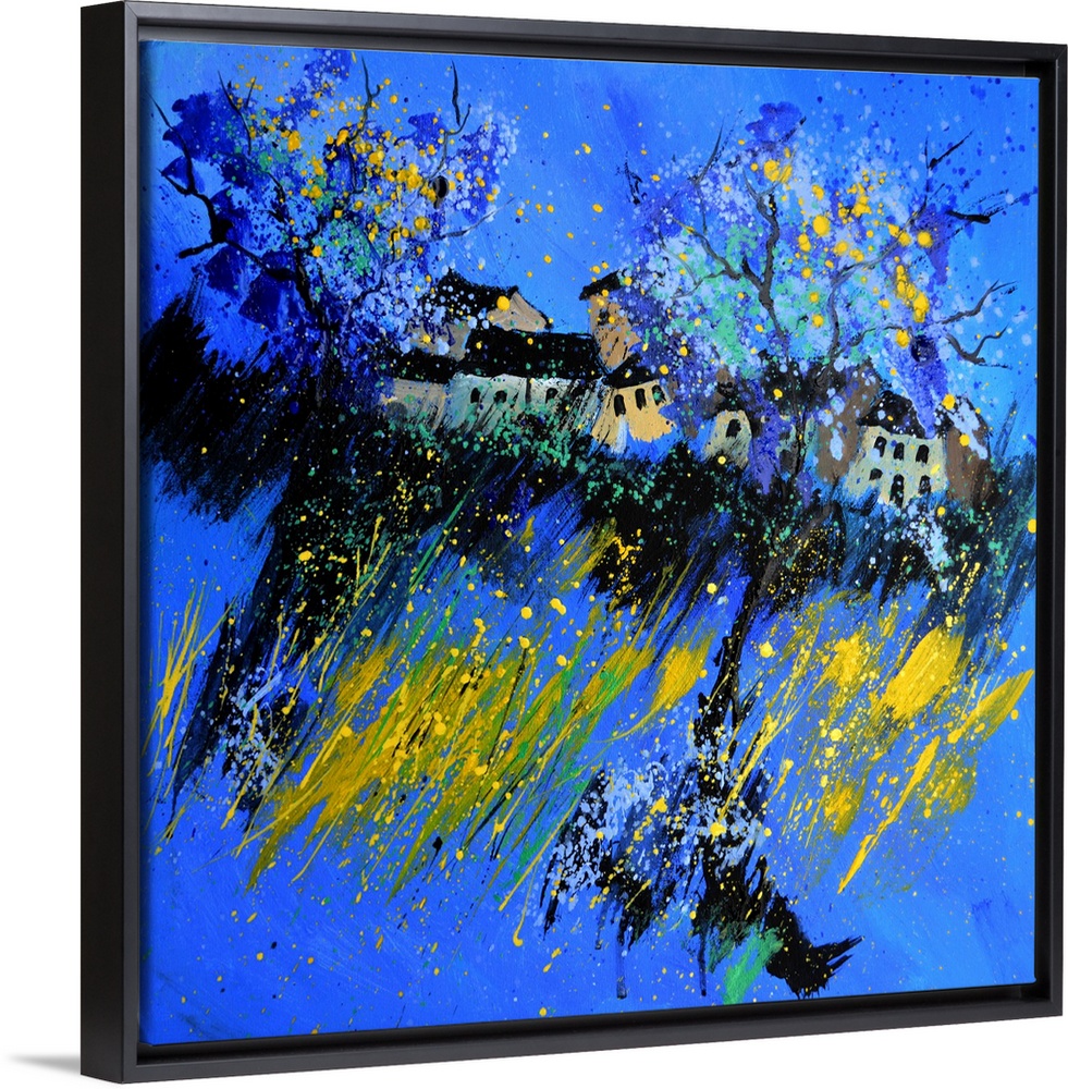 <p>Square abstract painting made in shades of blue, yellow and white with a small hint of pink representing a village.</p>