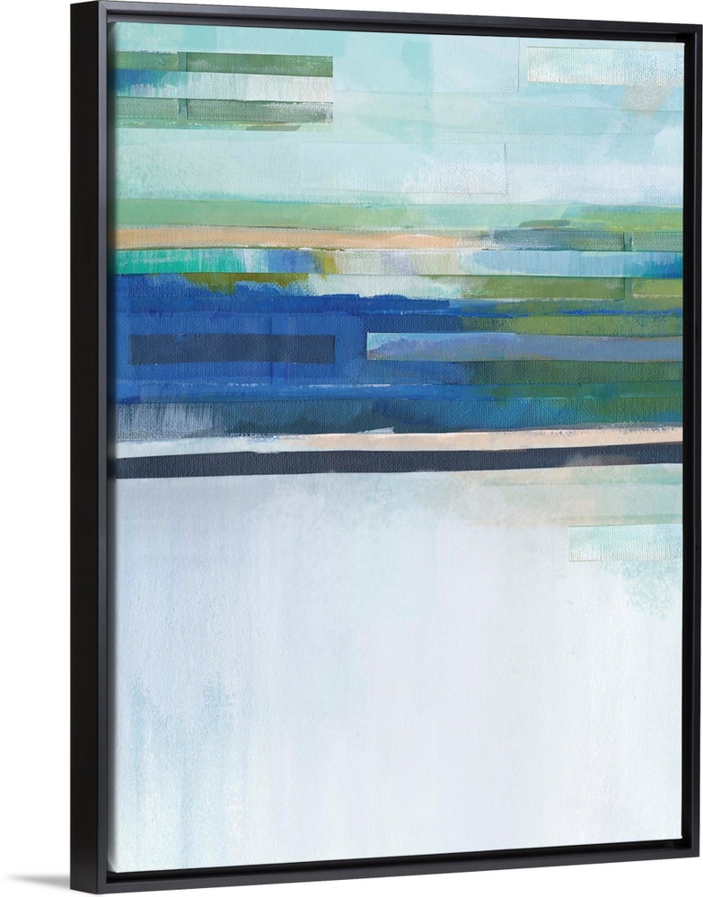 <p>Abstract painting in blue, green, and nude hues with layered lines at the top.</p>