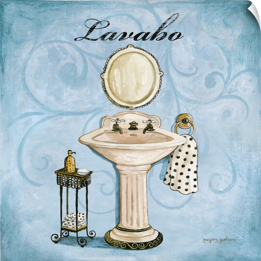 <p>Square bathroom decor with a black, white, and gold illustrated sink on a light blue designed background with the word "Lavabo" written at the top in black.</p>
