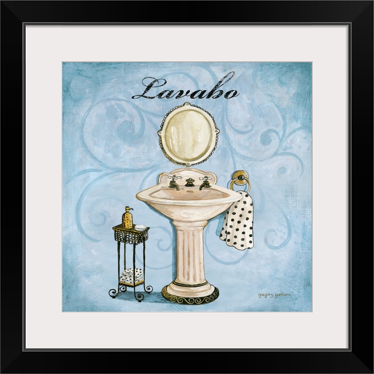 <p>Square bathroom decor with a black, white, and gold illustrated sink on a light blue designed background with the word "Lavabo" written at the top in black.</p>