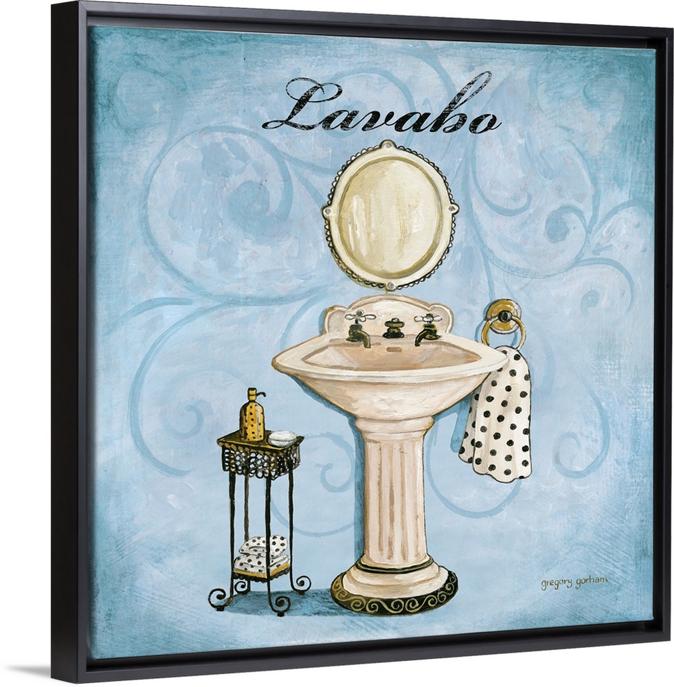 <p>Square bathroom decor with a black, white, and gold illustrated sink on a light blue designed background with the word "Lavabo" written at the top in black.</p>