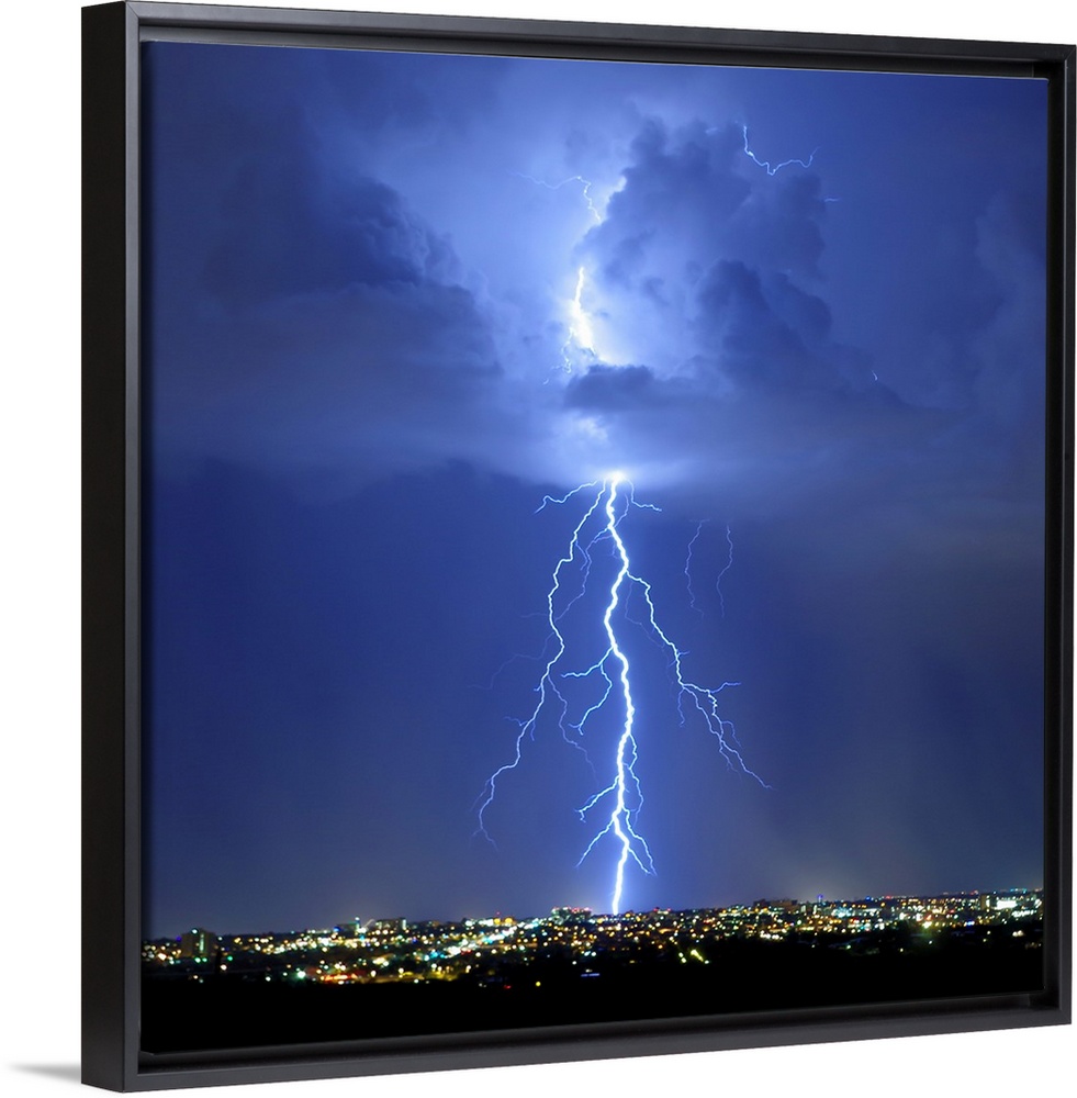 <p>Square photograph of lightning bolts in a blue sky above an Arizona city.</p>