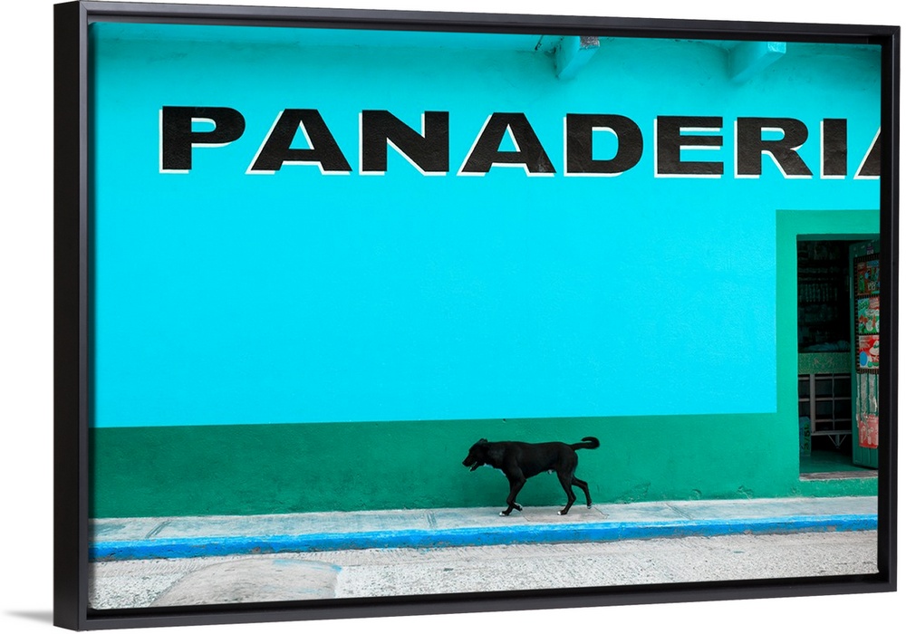 <p>Photograph of a stray black dog walking down the sidewalk in front of a bakery with blue exterior walls. From the Viva Mexico Collection.</p>