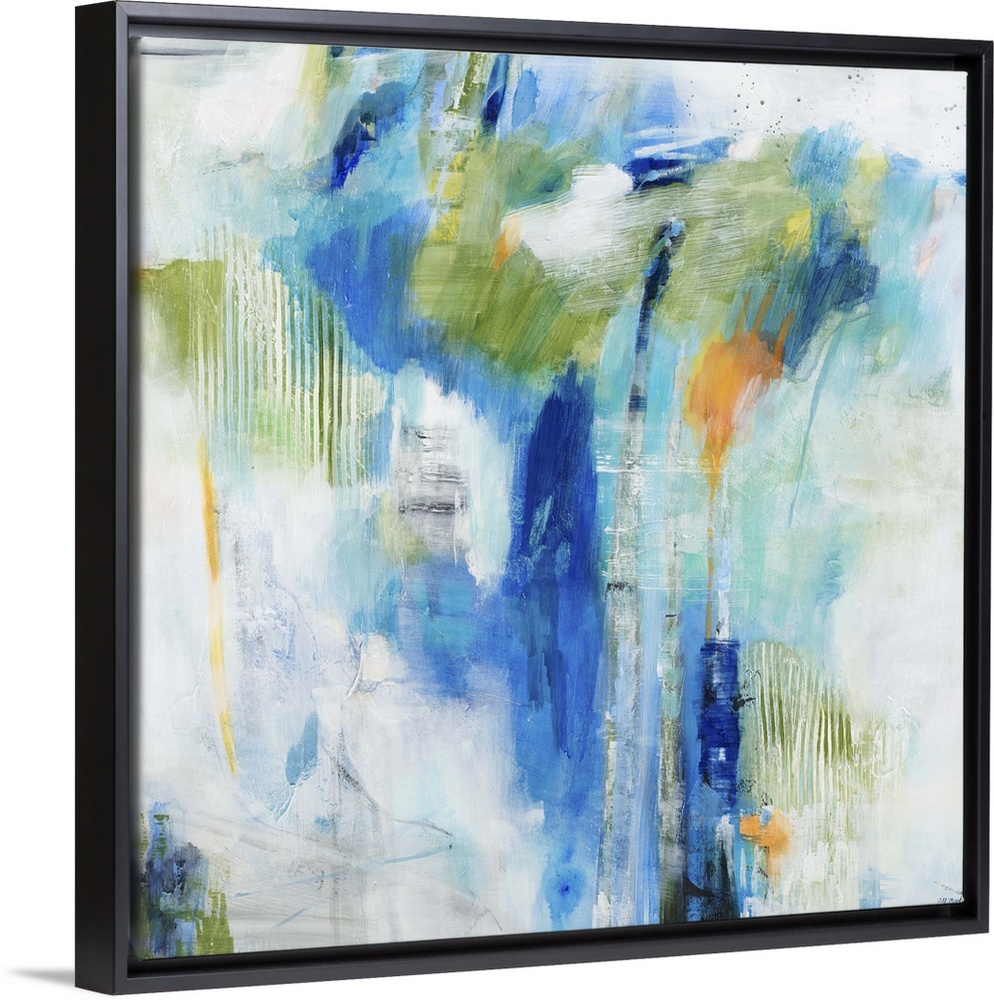 <p>Contemporary abstract painting of splashes blue and green tones against a neutral background.</p>
