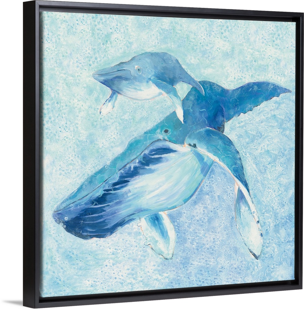 <p>Contemporary square painting of a whale and her calf in different shades of blue.</p>