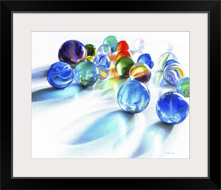 <p>Contemporary still-life artwork of glass marbles on a white surface with bright light shining through them.</p>