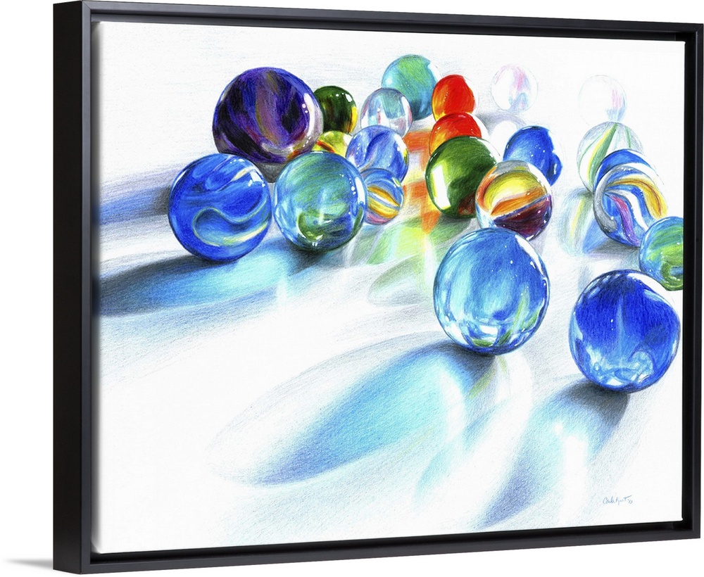 <p>Contemporary still-life artwork of glass marbles on a white surface with bright light shining through them.</p>