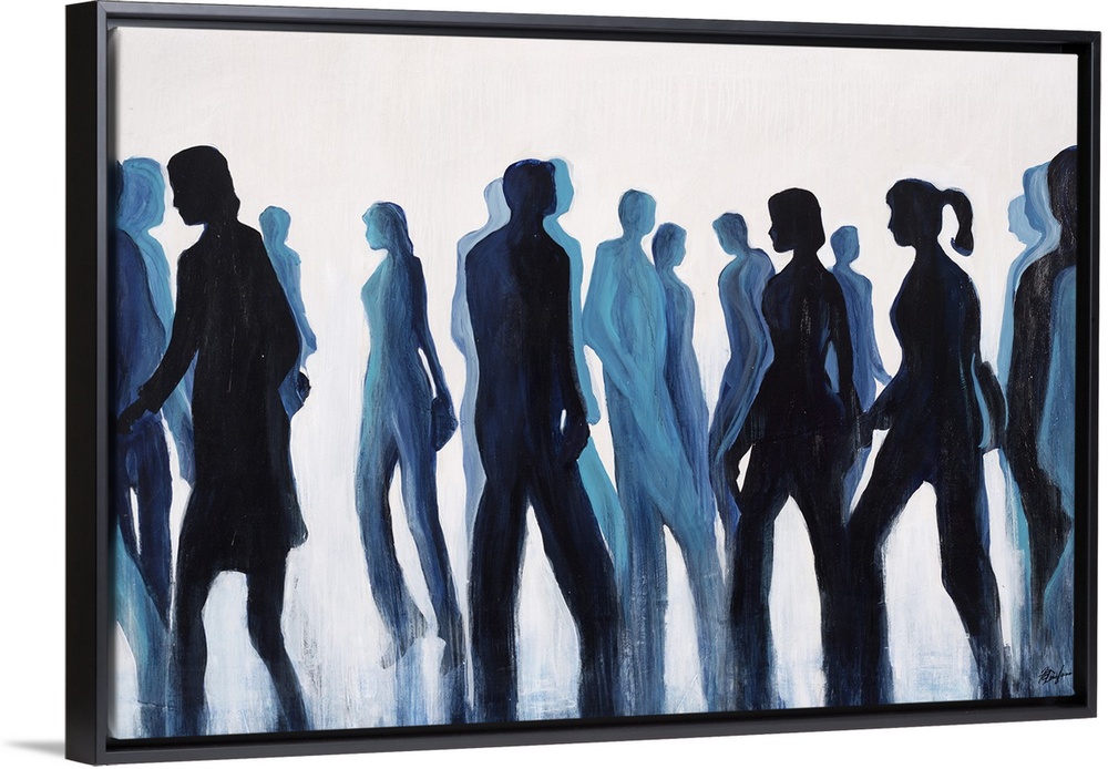<p>Contemporary painting of silhouetted figures in dark blue tones appearing to be walking.</p>