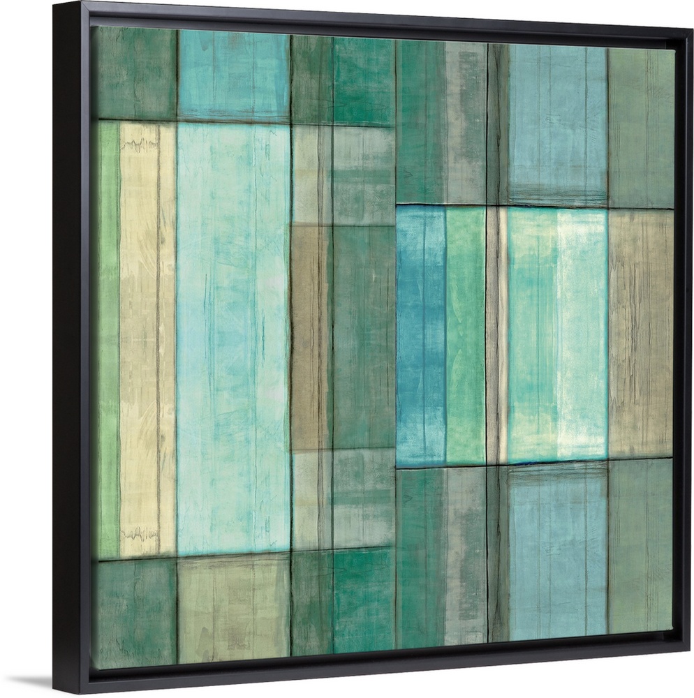 <p>This square shaped decorative wall accent is a grid of geometric rectangles and vertical lines filled with aquatic colored paints and rough textures.</p>