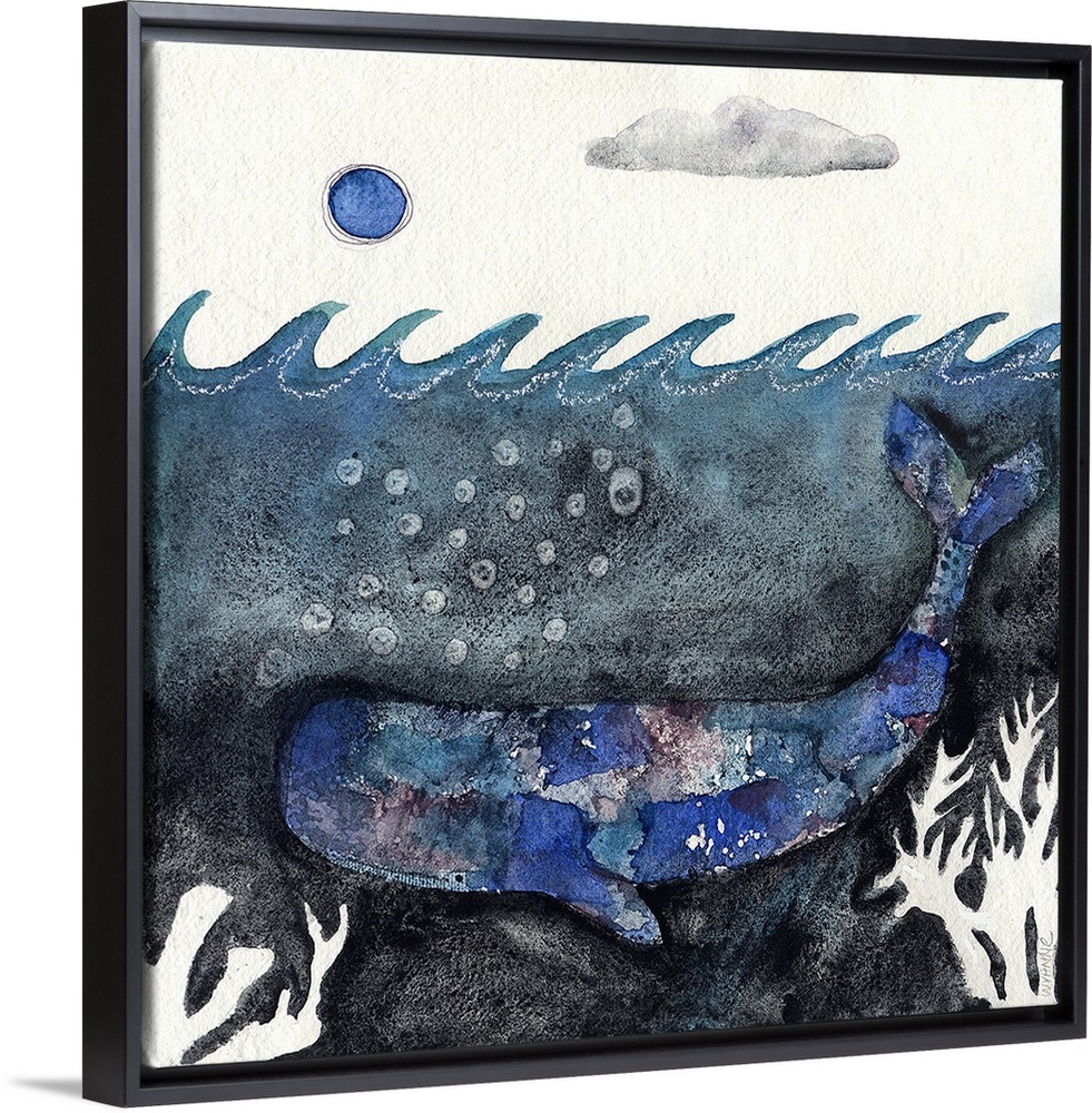<p>A deep blue whale in a dark ocean under the moon.</p>