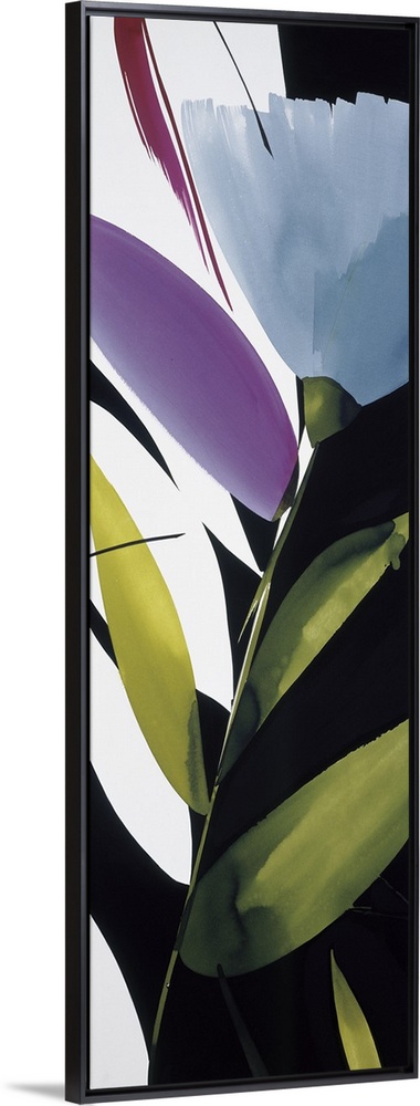 <p>A long vertical painting in a modern design of flowers and leaves on a black backdrop.</p>