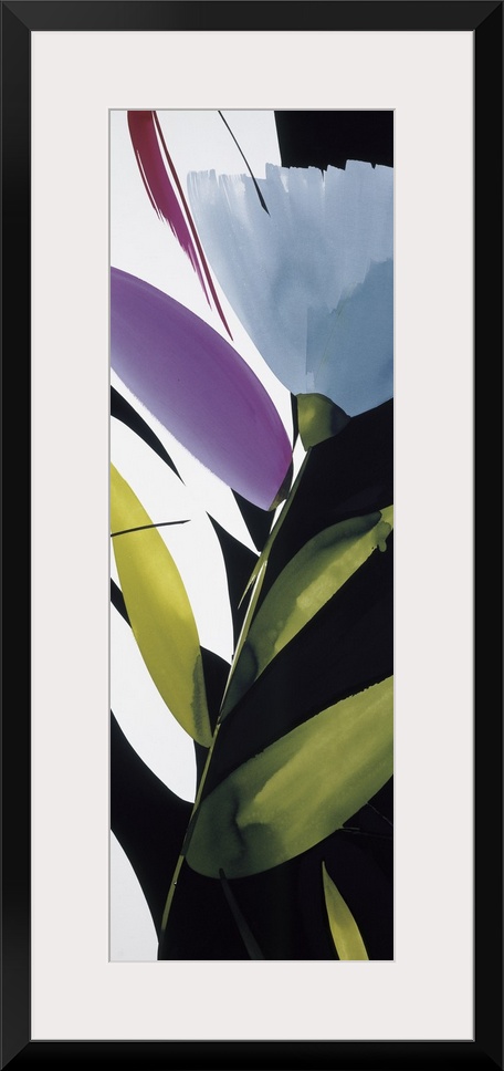 <p>A long vertical painting in a modern design of flowers and leaves on a black backdrop.</p>