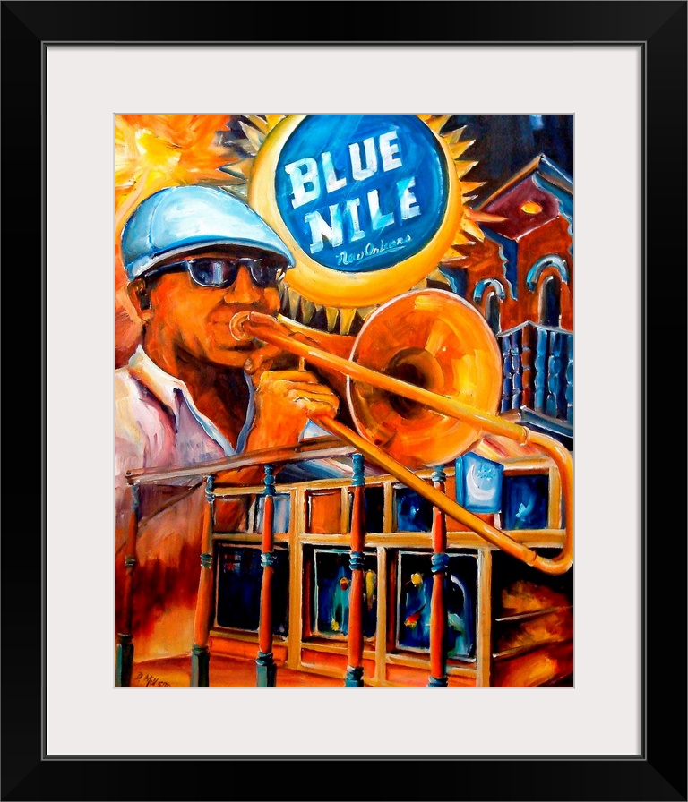 <p>This is a contemporary painting advertising a music venue in New Orleans while a jazz musician attacks the building with a giant trombone.</p>
