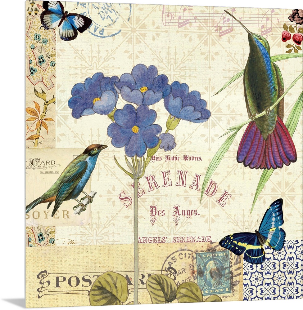 <p>A contemporary piece of artwork of a collage images. Including a bird with butterflies and blue flowers.</p>