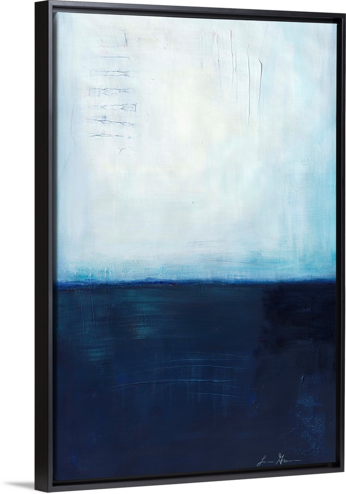 <p>Contemporary abstract painting using dark blue and light blue colors meeting almost in the middle to create a colorfield.</p>