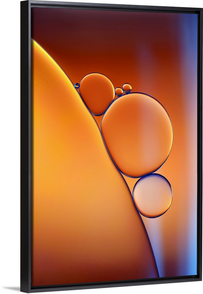 <p>Closeup photograph of drops of oil in water with shades of orange and blue.</p>