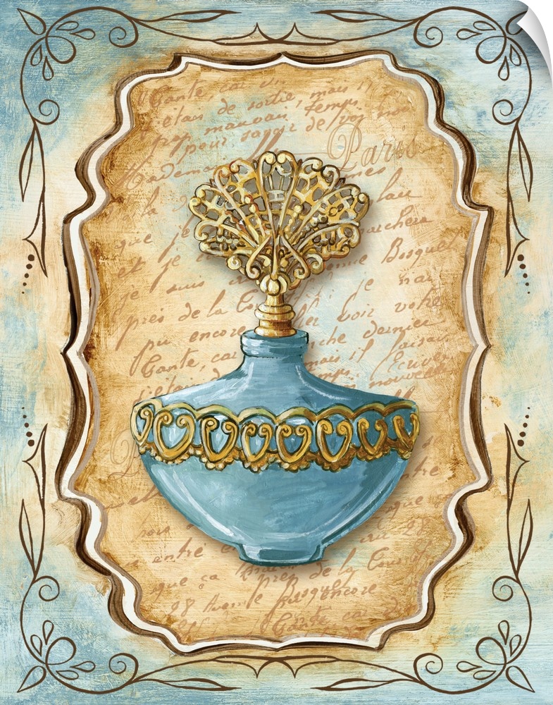 <p>Decorative painting of a vintage perfume bottle in light blue and brown tones.</p>