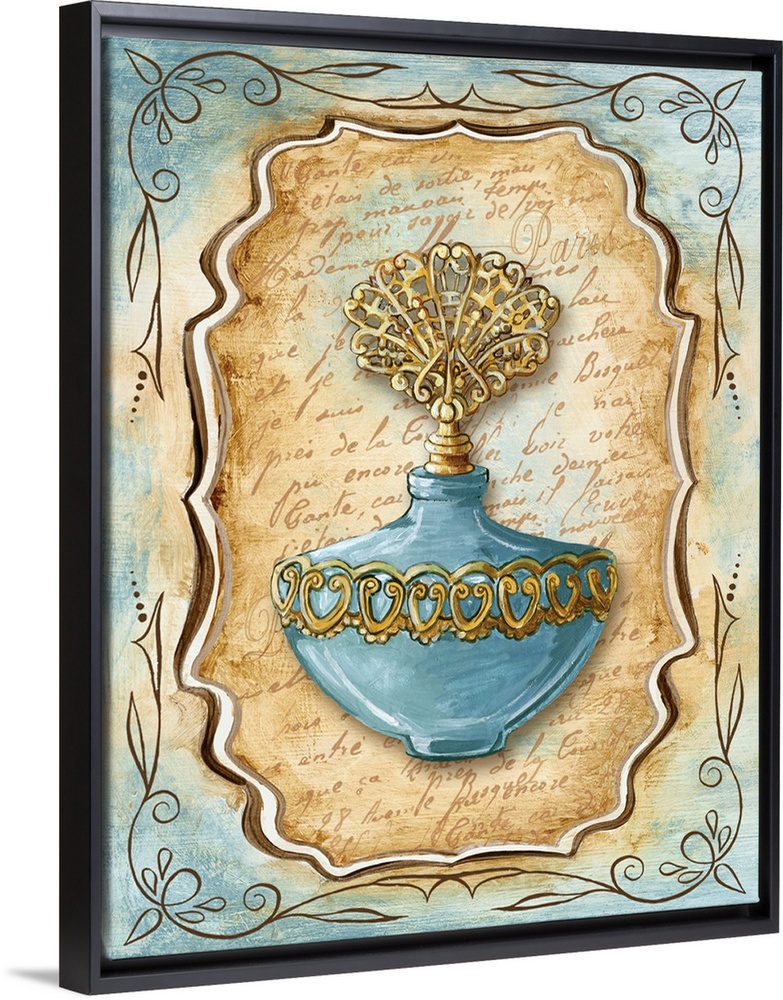 <p>Decorative painting of a vintage perfume bottle in light blue and brown tones.</p>