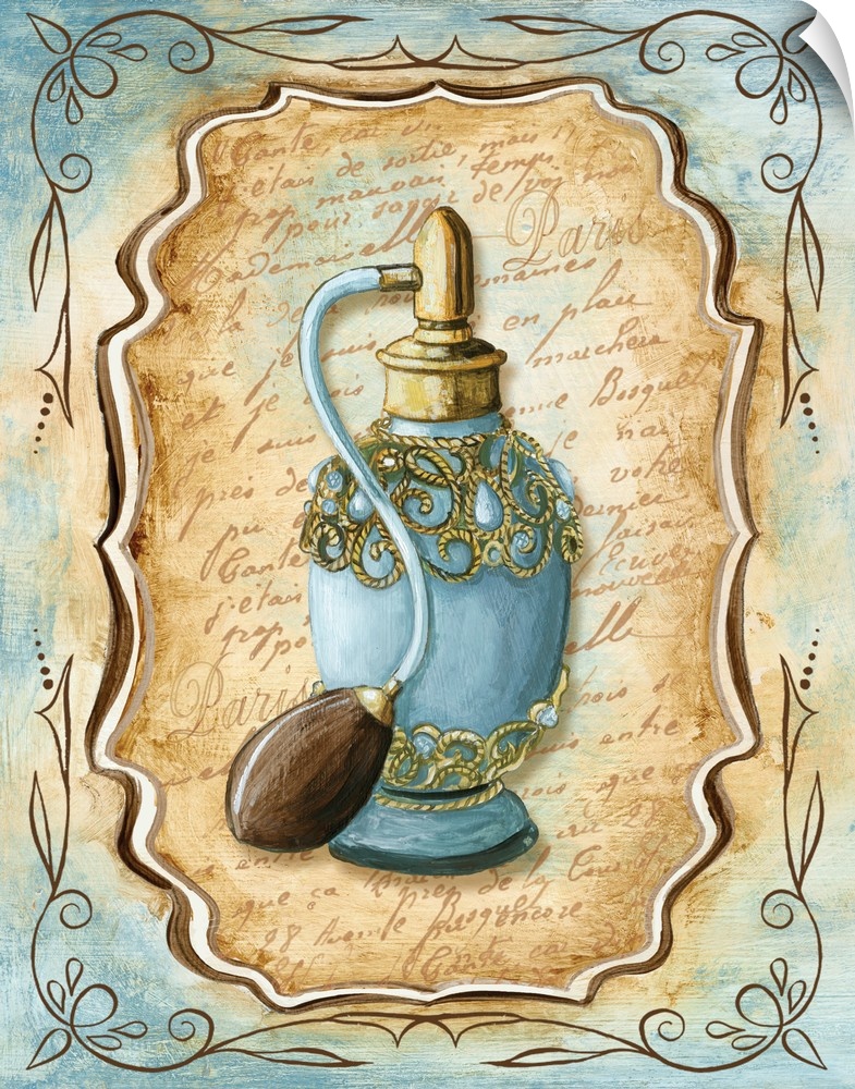 <p>Decorative painting of a vintage perfume bottle in light blue and brown tones.</p>