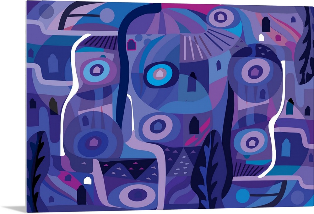 <p>A digital abstract landscape with circular shapes in vibrant shades of purple.</p>