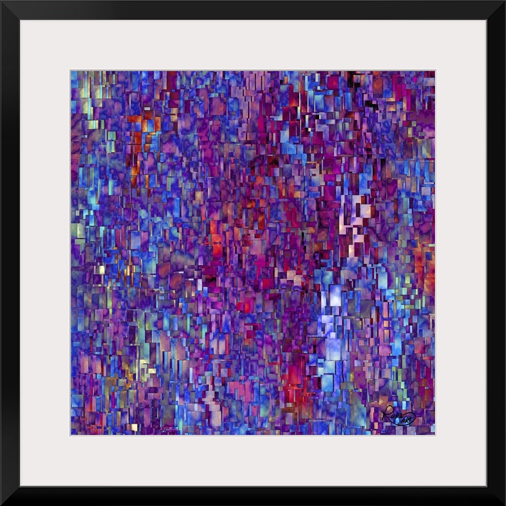 <p>Square abstract piece with tiny solid rectangles layered on each other to create a cracked look with mostly blue, red, and purple hues.</p>