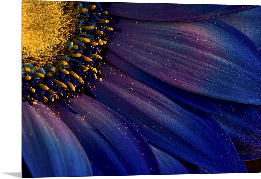 <p>Close up photo of the yellow center and deep blue petals of a flower, with bits of pollen.</p>